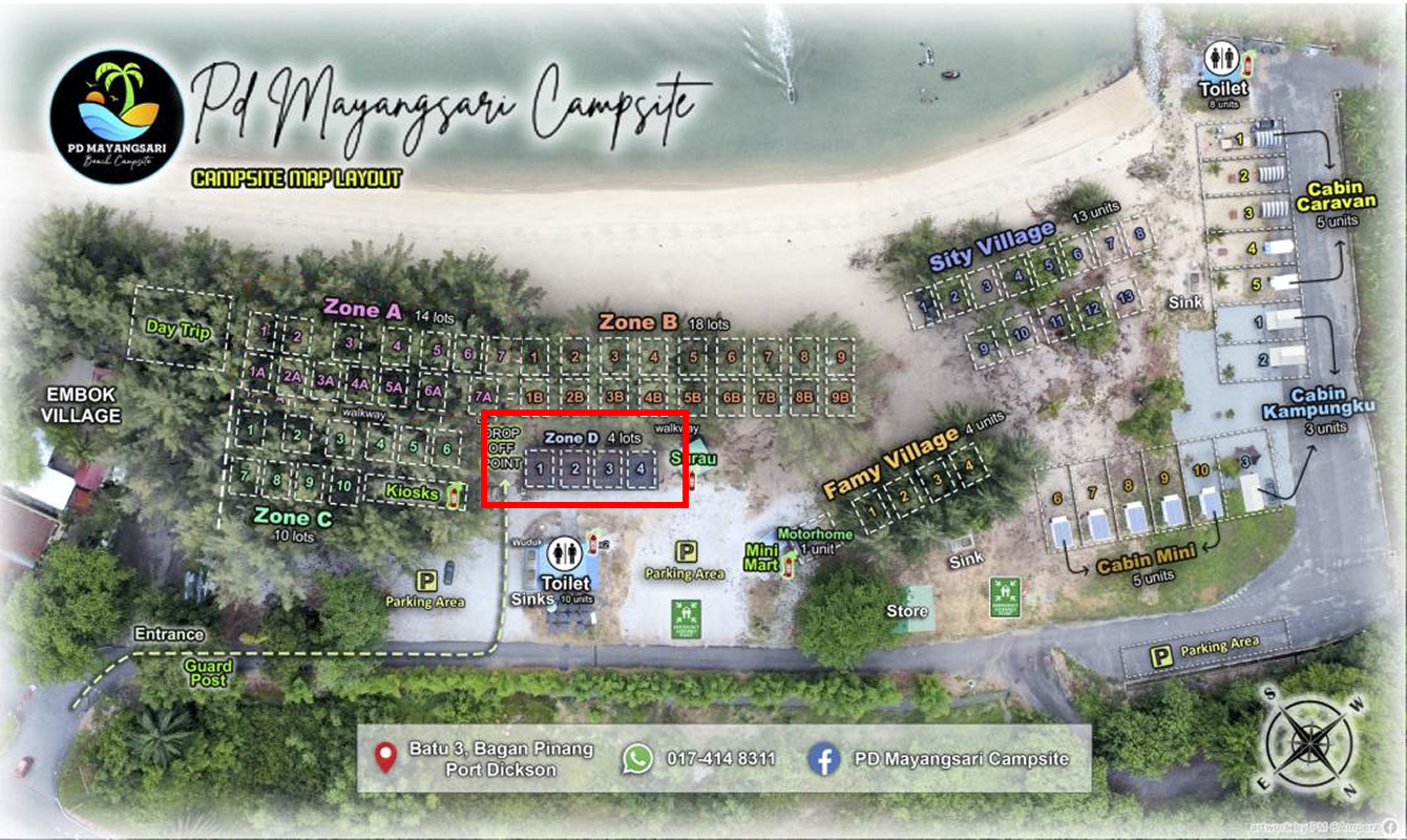 Lot size approximately: 6m (width) x 8m (length) Max 1 unit Large Tent or 2 units Medium/Small Tent Max pax: 6 pax Lot 1 - 4 non-seaview lots Check in: starts 10am Check out: last 8pm Other charges rate: 1. Parking: RM5 per car (pay once) 2. Toilet: RM5 per car (Day Trip) RM10 per car (2D1N) RM15 per car (3D2N) 3. Electric: RM10 per night per lot 4. Wire Extension: RM10 per wire (pay once) Remarks: Other charges pay upon arrival at campsite.