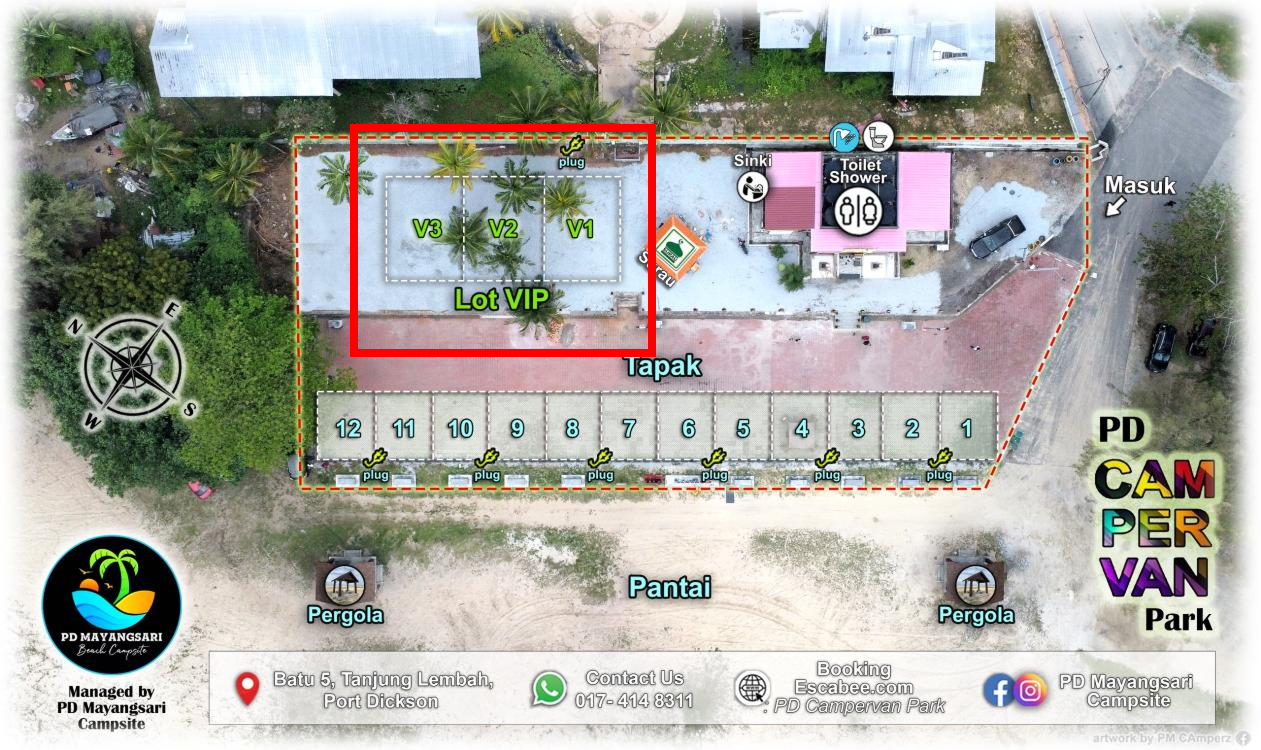 1. Tapak Khemah -Check in: starts 8am -Check out: last 8pm 2. 1 lot max 6 pax -Lot size approximately 8m x 10m. - 1 khemah + 1 Flysheet/Dome 3. Additional pax, charge RM10 per head 5. Electric (24hours) fee: RM10 for 1 night per lot 6. Toilet (24 hours) (optional) fee: a. RM5 for 1 night per car b. RM10 for 2 nights per car 7. Wire extension (optional): RM 10 per rental 8. Customer can bring your own camping gears. 9. No shifting campsite picnic table.